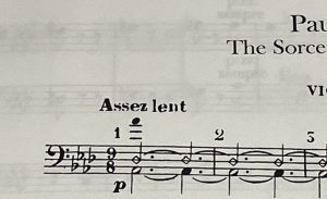 ところで、「魔法使いの弟子」の冒頭部分、弦楽器パートの楽譜に見慣れない音符が出現します。チェロパートはこのようになっており、