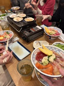 景気づけの一杯!といきたい気持ちは歯を食いしばって堪え、はまぐりとホタテ、海鮮丼を摂取しました。