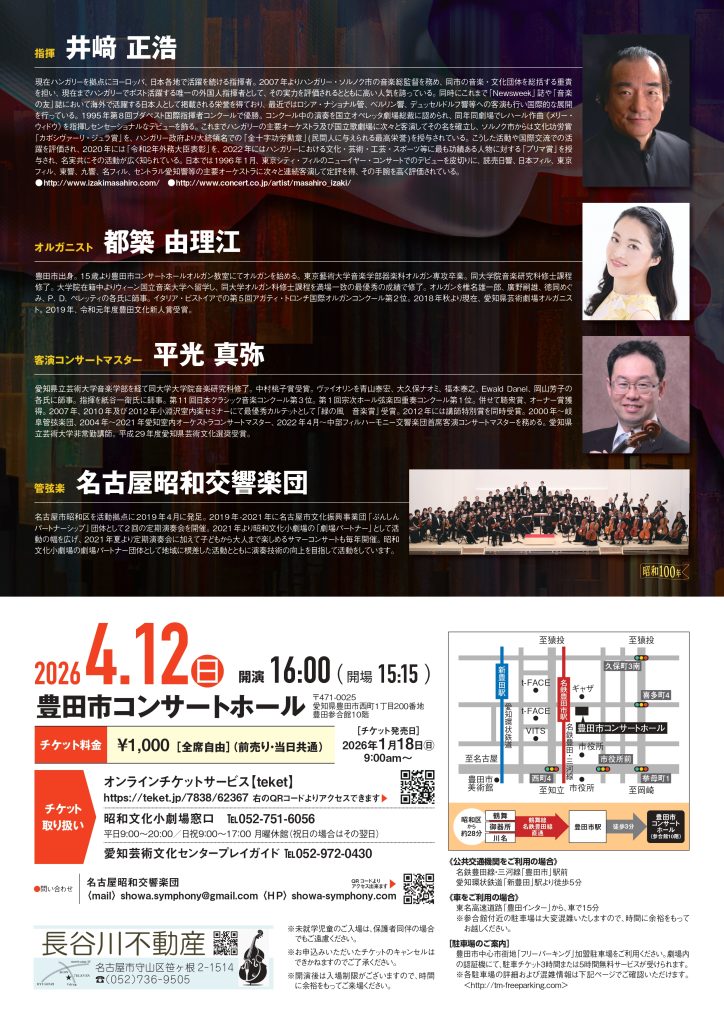 | 出演者 | 指 揮:井崎 正浩 オルガニスト:都築由理江 ゲストコンサートマスター:平光 真弥 管弦楽:名古屋昭和交響楽団 |
